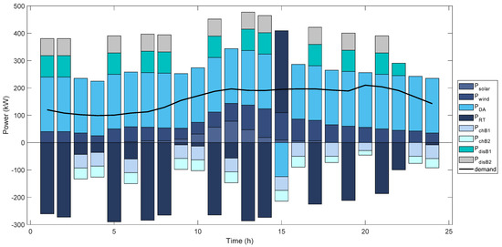 Optimal dispatch when the VPP participates in the RT market. Solar power (), wind power (), power traded in DA (), power traded in RT (), battery charging power 1 () battery charging power 2 (, battery discharging power 1 (), battery discharging power () and demand power (demand).