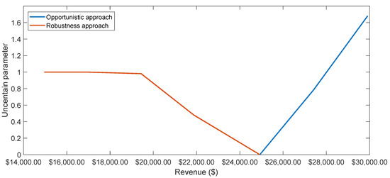 After defining the expected profits in the deterministic approach, the bidding strategy to quantify the effect of solar generation on VPP revenues is proposed. This strategy considers modelling the positive and negative impacts of solar fluctuations. Figure 4 and Table 3 show the behaviour of the uncertain parameter considering different cost targets. The blue line shows how much the solar generation forecast would have to change for the VPP to obtain greater profits than expected. On the contrary, the red line indicates how the uncertainty of the solar generation would negatively affect the expected profits. The VPP is immune to the negative variation on the solar generation when the expected revenue is less than USD 19,500. It is important to note that the profit obtained by the VPP is not influenced to a great extent by the solar uncertainty, since to obtain an additional 10% of profits, the solar generation would have to change by 78%.