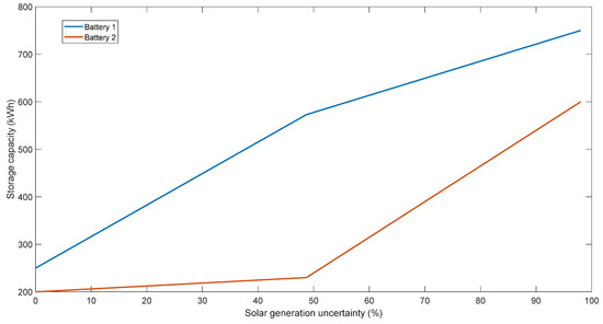 The calculated storage system’s capacity would deal with a decrease of 48.7% and 98% of solar generation. Table 4 and Figure 5 show that the batteries must increase their capacity to deal with the fluctuations. With a reduction in PV production of 48.7%, B1 must increase their capacity from 250 kWh to 572 kWh (more than double), and B2 must increase from 200 kWh to 230 kWh. In the case of a reduction of PV productions of 98%, B1 should increase from 250 kWh to 750 kWh (three times), and B2 should increase from 230 kWh to 600 kWh (more than three times). Additionally, the capital costs that the VPP would have to incur to guarantee this storage capacity are evaluated in the same table. This study assumed that the batteries were Li-ion and that the capital cost for the energy capacity would be USD 236/kWh, according to [33]. On the other hand, Figure 6 compares the optimal dispatches on day 1 when VPP bids in the RT market while considering the deterministic approach with when VPP considers increasing the capacity of the storage system to deal with solar generation uncertainty. If the amount of solar energy is reduced, the amount of charge and discharge energy in the batteries increases during each moment in time.