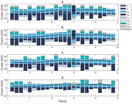 Comparison of optimal dispatches on day 1. (a) The VPP offers in the market in real time. (b) The VPP bids in the market in real time with a reduction in solar generation of 35.5%. VPP examples when increasing the storage capacity to compensate for the reduction of solar generation to (c) 48.1% and (d) 98%.