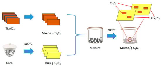 Schematic diagram of the MXene/g-C3N4 photocatalyst synthesis process.
