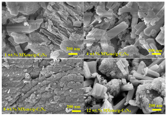 FESEM images of the as-synthesized MXene/g-C3N4 heterostructure photocatalysts.