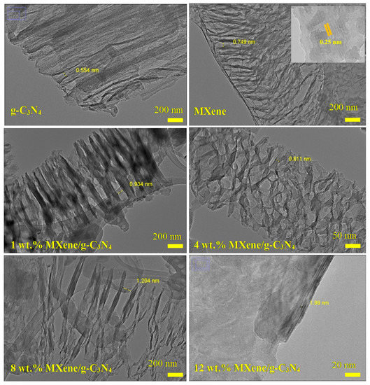Figure 4 represents the FESEM micrograph images of the as-synthesized MXene/g-C3N4 heterostructure photocatalysts prepared at different amounts of MXene loadings. The FESEM images demonstrated the successful formation of layered MXene by etching the Ti3AlC2 MAX using HF [25]. Generally, the Ti3AlC2 structures were made up of an irregular block structure. However, after the etching process with HF, the as-prepared MXene demonstrated an obvious stratification, evincing the successful etching process of aluminum layers. Meanwhile, the presence of a crumple-sheet-like structure in the composite heterostructure photocatalysts is attributed to the morphological structure of the g-C3N4 [26,27]. All of the FESEM images displayed the encapsulation and intimate contact between both g-C3N4 and MXene, evincing the successful development of the heterostructure system. In addition, as both the g-C3N4 and MXene form the 2D nanostructure, intimate contact between each photocatalyst was observed. In light of this, a smooth photocharge carrier transfer was postulated with respect to its well-matched geometrical structure. Thereafter, the issue of the fast recombination of the photocharge carriers within the individual photocatalyst can be mitigated. Moreover, Figure 5 represents the TEM images of the as-synthesized MXene/g-C3N4 heterostructure photocatalysts. A typical 2D multilayered structure could be seen from the inset in Figure 5, where the interlayer spacing measured 0.25 nm. The aforesaid interlayer spacing corresponds to the (101) crystal plane of Ti3C2 MXene [25,28,29]. After the etching process of Ti3AlC2, the structure of Ti3C2 MXene with a very small spacing has been produced. Nevertheless, the lattice fringe of the pure g-C3N4 photocatalyst was hardly visible, presumably due to the low crystallinity. On a whole, the FESEM and HRTEM analysis verified the successful interfacial contact between both MXene and g-C3N4 particles, which will be beneficial for augmenting the photocharge carriers’ separation and migration, resulting in an enhancement in the photocatalytic degradation activity.