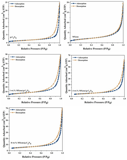 Nitrogen adsorption–desorption isotherms of the as-synthesized MXene/g-C3N4 heterostructure photocatalysts.