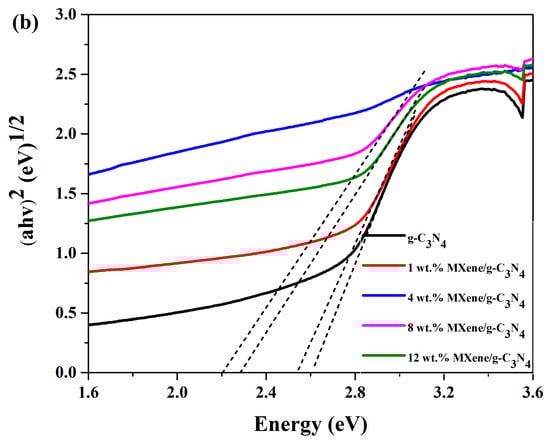 The optical properties of the as-synthesized MXene/g-C3N4 heterostructure photocatalysts prepared at different amounts of MXene loadings were examined using UV-Vis diffuse reflectance spectra (DR-UV-Vis). Figure 7a shows that the g-C3N4 photocatalyst showed a light absorption capacity within the visible-light region. Similarly, the loading of the MXene onto g-C3N4 photocatalyst further narrowed the light absorption capacity with a slight blue shift and red shift in accordance with the amount of MXene loading. In turn, this observation indicates the potential of the photocatalytic light absorption response up to 48% of the total solar light energy. Moreover, as the composite MXene/g-C3N4 heterostructure photocatalysts possess a stronger visible-light absorption capacity, the enhancement in photothermal effect could be observed, which would be beneficial in aiding the photocatalytic activity of the aforesaid samples. Following that, Figure 7b illustrates the plotted and estimated bandgap energy using Tauc plot calculation. The bandgap energy of the pure g-C3N4 was 2.61 eV. The obtained bandgap energy aligns with several previously reported works on g-C3N4 photocatalysts [30,31]. As depicted in Figure 7b, the bandgap energy for the 1 wt.% MXene/g-C3N4, 4 wt.% MXene/g-C3N4, 8 wt.% MXene/g-C3N4, and 12 wt.% MXene/g-C3N4 samples were 2.53, 2.09, 2.20 and 2.31 eV, respectively.