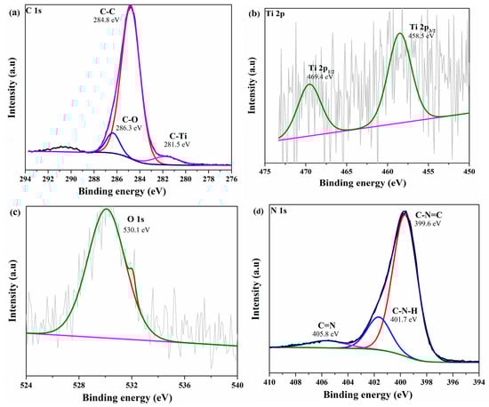 The elemental and surface chemical properties of the 1 wt.% MXene/g-C3N4 heterostructure photocatalyst were examined via XPS analysis. Figure 8 delineates the XPS spectrum of C 1s, Ti 2p, O 1s, and N 1s. As displayed in Figure 8a, three significant peaks were observed in the C 1s spectrum. Accordingly, the observed peaks, located at 281.5, 284.8, and 286.3 eV, confirm the presence of the C-Ti, C-C, and C-O bonds, respectively, in the 1 wt.% MXene/g-C3N4 heterostructure photocatalyst [13,24]. The reason behind the observed peaks is the presence of the g-C3N4 particles in the heterostructure sample. Moreover, the peaks located at 284.8 eV are attributable to the C-C adventitious carbon that was used as the energy reference in fitting the XPS spectrum of the 1 wt.% MXene/g-C3N4 heterostructure photocatalyst.