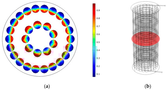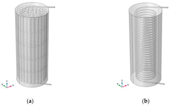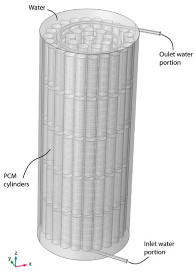In this numerical study, a heat exchanger in a tankless configuration based on the research by Bayomy et al. [13] was selected as a reference system to be redesigned. In addition to the benefits of this configuration in terms of health factors [7], it also provides good internal space to test different amounts, encapsulation shapes, and topology of the PCM in a redesign process. The proposed system only allows the hot drinking water to pass through a coil. A combination of water and PCM cylinders was placed outside the coil to store thermal energy, as presented in Figure 1.