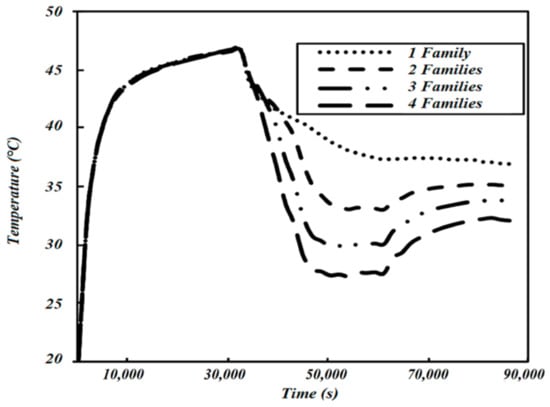 The approach carried out in the reference study was to achieve the highest efficiency in harnessing the most considerable amount of energy stored in the PCMs without defined targets in terms of the minimum outlet water temperature and minimum efficiency. However, it is observed in Figure 2 that the greater the number of families, the more noticeable the decrease in temperature during discharging time.