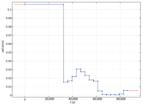 Water velocity in the coil for the demand of 2 families (400 L) vs. time.