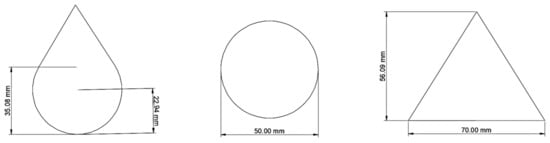 Three encapsulation shapes were evaluated: drop-shaped, triangular, and circular cross-section prisms. The circular cross-section prisms were cylinders, the same shape as in the reference TES. In all cases, the cross-section area was designed to maintain the same PCM volume per prism, as shown in Figure 4. The prism’s height was fixed as 200 mm.