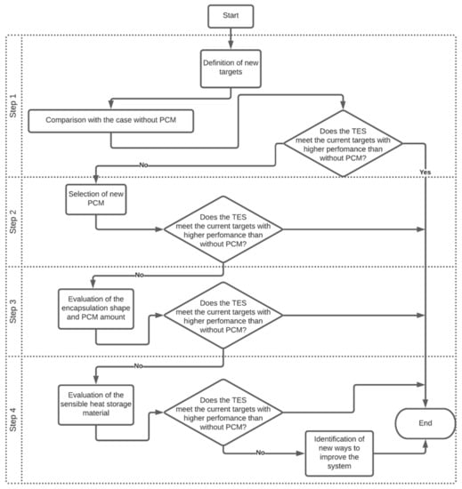 A four-step redesign methodology was proposed based on the four improvement opportunities previously defined. This included the evaluation of operating conditions and new design targets, the comparison between the reference TES with and without PCM (step 1), the PCM selection through multi-criteria decision-making methods (step 2), the evaluation of the amount and shape of the PCM (step 3), and sensitivity analysis of the effect of the sensible heat storage material on the PCM performance (step 4). Every step was implemented through numerical simulations in COMSOL Multiphysics 5.6 (Burlington, MA, USA).