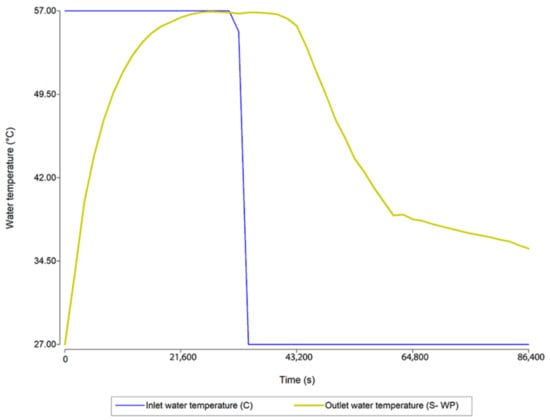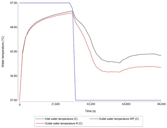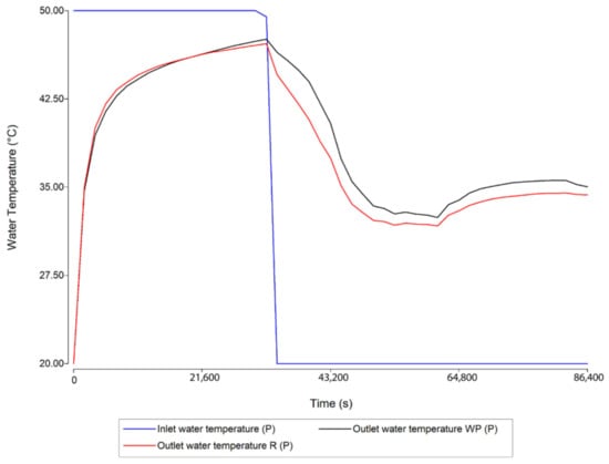 The current input allowed a similar charge profile, as depicted in Figure 8. Like under previous input, WP reached a higher maximum outlet water temperature (52.35 °C) compared to obtained by R after the charging time (51.05 °C). During discharging time, WP increased its energy release capacity compared to the case with PCM, which was ≈21.71% higher. At the same time, the efficiency and the operating hours were higher in WP for both previous and current operating conditions.