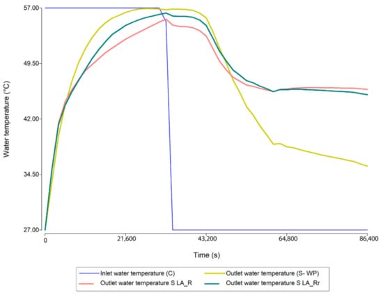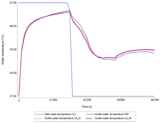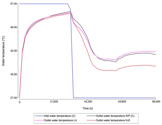 Figure 9 shows that the outlet water temperature profile in the LA_R was always higher than the profile obtained with the N-E_R. When comparing LA_R and WP outlet water temperature profiles, the latter could maintain higher temperatures during the first hours of discharge, which were the highest hot water demand hours. When the hot water demand decreased after ≈50,000 s, the LA improved the outlet water temperature by approximately 1 °C.