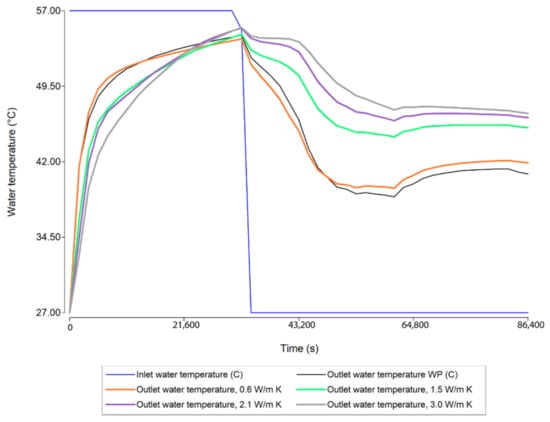A sensitivity analysis through several numerical simulations was performed to quantify the effect of the thermal conductivity of the sensible heat storage substance on the TES performance, maintaining the same sensible heat storage capacity as water (Cpw = 4169.45 kJ/m3·K at 25 °C) [52]. Based on the sensitivity analysis results, a sensible heat storage material with suitable characteristics for the application was selected. Then numerical simulations of the TES with only this material, and with PCM, were performed.