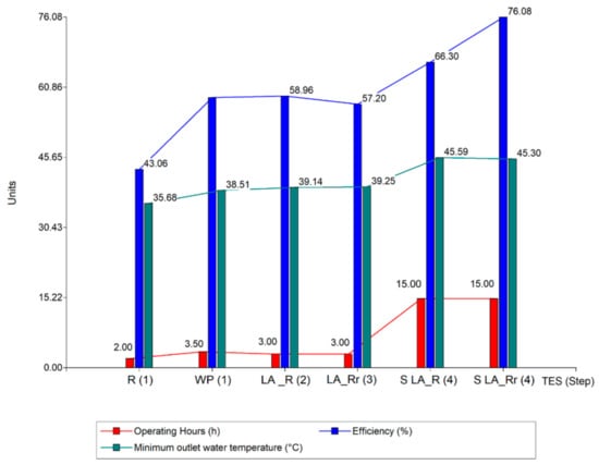 The efficiency and minimum outlet water temperature also underwent small changes when applying steps 2 and 3. The application of step 4 represented an increment of ≈10 °C in the case of the minimum outlet water temperature, and the efficiency increased by ≈33% compared to R, and by ≈17.5% compared to WP. The final proposed redesigned TES (S LA_Rr) presented efficiency of 76.08%.