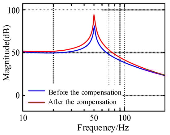 MATLAB was used to produce a contrast diagram of the amplitude–frequency characteristic curve from Figure 2 and Figure 4, as shown in Figure 5. It can be seen from Figure 5 that the loop gain at the fundamental wave of the system increases after the reference current compensation is introduced. This indicates that the proposed control structure can track the instruction value better and the grid-connected current steady-state error is reduced.