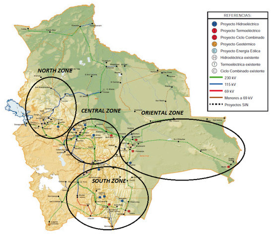 The energy demand of Bolivia is mostly residential. The demand is divided into two categories: regulated consumers supplied by distribution companies and non-regulated that directly participate in electricity markets [35]. By 2020, the energy demand is higher in the Oriental zone at 38.5%, next is the North zone with 23.39%, followed by the Central zone with 22.36% and finally the South zone with 15.69% [35]. The energy demand increased from 8378 GWh in 2016 to 9212 GWh in 2020. For the following years, the projection of the demand was based on large consumer statements, bottom-up methods, methods based on interpolation of growth rates and methods based on the evolution of specific consumption by categories of distributors. A growth rate at an average of 4% per year was determined, reaching a demand of 12,310 GWh for the year 2025 [42].