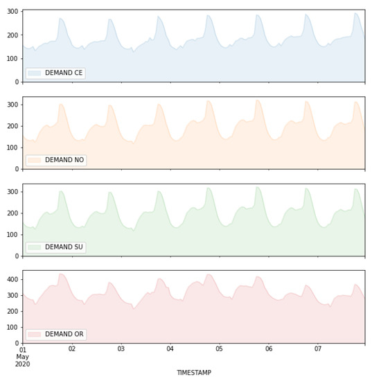 The time resolution of the energy demand time series is hourly for a period of one year.The energy demand for the year 2020 was extracted from [45] and is provided individually for each zone of the power system mentioned before. Figure 4 and Figure 5 show examples of load curves for the four zones comprising the power system. The load time series for the year 2025 is determined by applying a yearly growth rate to the 2020 load time series, identified from [42].