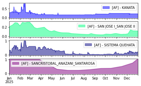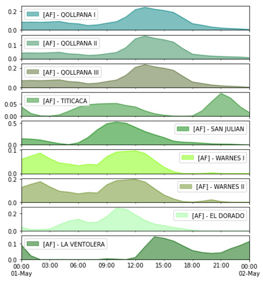 - Times series related to the energy demand in each node of energy consumption: central, north, oriental and south zone. The baseline time series are obtained from the national system operator (e.g., CNDC [45]). However, this demand cannot be considered constant in time. A percentage factor of demand growth is therefore assumed for future scenarios.