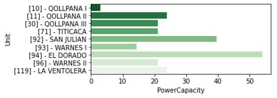 The VRES potential in Bolivia is distributed throughout the territory. Hydro-run-of-river (HROR) projects are found in all four zones of the SIN; however, the main HROR projects are located in the central and south areas. Solar energy is feasible in all regions but is particularly suitable for the Andean highlands sector due to its high levels of radiation. Finally, in the departments of Cochabamba and Santa Cruz and in some highland areas nearby, wind energy is predominant [23]. Despite the VRES expansion potential shown in Figure 6, Figure 7, Figure 8 and Figure 9, the projects planned until 2025 only represent 9.24% of the total effective capacity by that year.