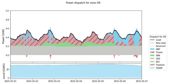 - Non-dispatchable units (e.g., wind turbines, runoff-river, etc.): For renewable technologies, the maximum time-dependent generation level is set to directly influence the available factor of the power unit. The outage factor is also taken into account as unavailable power.