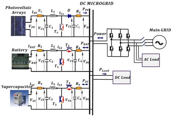 where , , , , , , , , , , , , , , and are known positive values of resistances, inductances and capacitors respectively, and represents the DC demanded power load. To model the switches, small resistances and are included to take into account conduction losses. and are the photovoltaic panel, battery, supercapacitor and DC MicroGrid voltages, respectively. The measured output vector is composed by and . The control inputs and represent the duty cycles of each converter. Equation (4) describes by Kirchhoff’s law the voltage variation due to the sum of all currents in the DC bus .