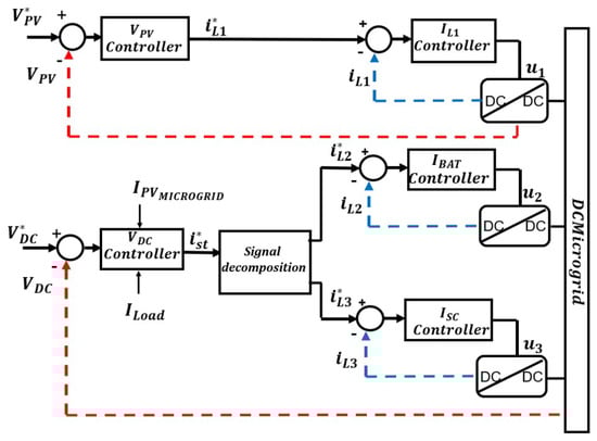 The target for the controller is to stabilize the DC bus voltage around the desired value, then ensuring power quality and allowing the DC MicroGrid to manage the desired amount of power. The proposed control will be based on two control layers (see Figure 2). First, we define the high level controller to give reference values for lower local controllers. Thereafter, we develop a local control using backstepping and Lyapunov-based techniques.