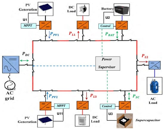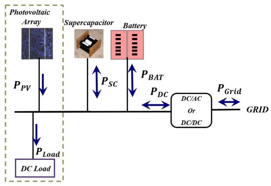 with , where is the PV power, is the storage power, is the battery power, is the supercapacitor power, is the load power and is the DC grid power.