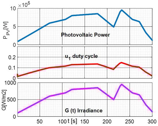 Figure 6 on the left shows the output power for the photovoltaic system with varying irradiance. It can be seen that the output power follows the irradiance variations. Figure 6 on the right shows the control input , which is bounded between zero and 1. One can see that the local controller keeps the PV tracking its Maximum Power Point.