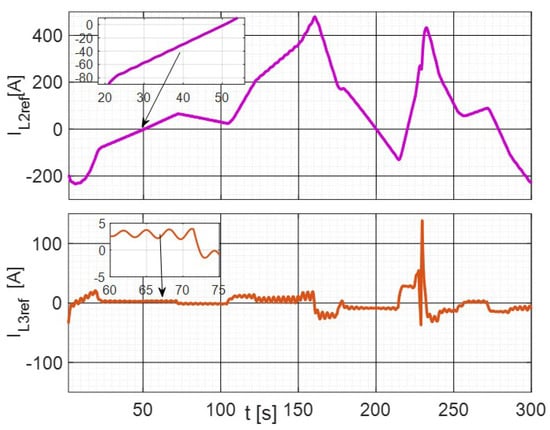 We rely on the storage system (battery + supercapacitor) to act as a buffer to absorb the current (power) variations and stabilize the DC bus. Based on the physical characteristics of the storage components, and in particular on the current limitations from the battery, we indicate: 1—to consider a current reference based on power balance equations for the whole system; 2—to use a time-scale separation to decompose it in two components, a fast one () and a slow one (), as shown in Figure 3. The slow component will be used as the reference for the battery’s power supply, while the fast component will be the reference power for the supercapacitor. This time-scale separation is obtained by the introduction of a first-order low-pass filter that decomposes the current reference in two references for the battery and supercapacitor [40]