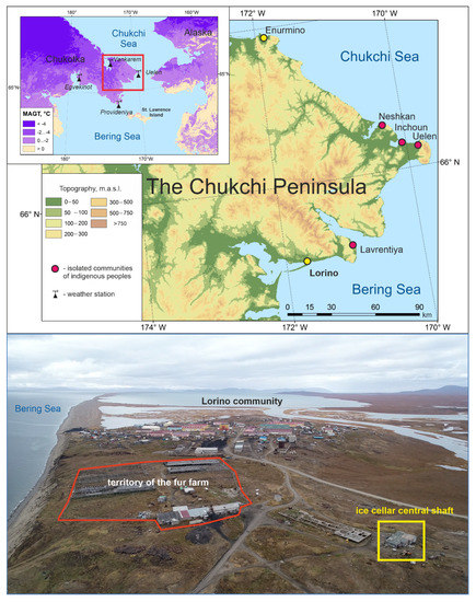 The territory of the Chukchi Peninsula (NE Russia) was once a part of the large paleogeographic region Beringia [8,9]; now it features the unique cultural legacy. During the 20th century, that region was experiencing the process of intensive economic development. Developing the local economy, they reorganized local communities into kolkhozs: state-owned collective agricultural enterprises established for reindeer herding and polar fox farming. Fox farming required facilities for the year-round storage of meat resulting from deceased foxes. For this purpose, large industrial ice cellars were constructed in permafrost in every community of the Chukchi peninsula in the 1950s and 1960s [10]. Those facilities were dug using heavy machinery for metro construction and were different in design and capacity depending on community population and the fox farm size. In this way, ice cellars in Chukotka differ from those in other regions [6] and represent a combination of traditional knowledge and modern technologies.