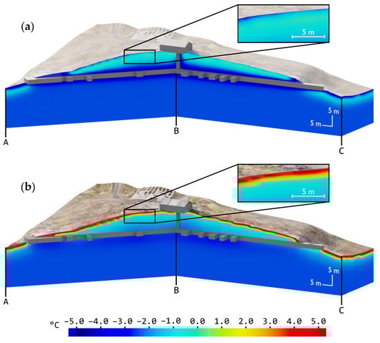 (a) Distributions of soil temperature around the ice cellar during the cold (15 March) season according to 2019 data. (b) Distributions of soil temperature around the ice cellar during the cold the warm (15 September) season according to 2019 data.