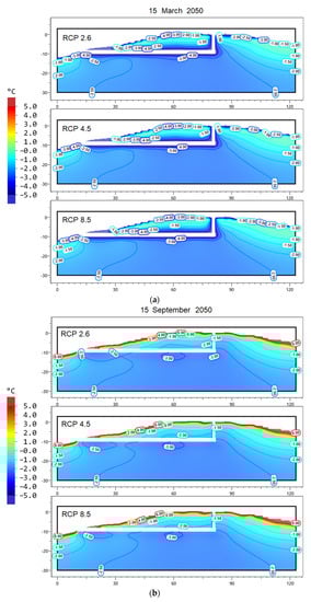 We prepared a simulation for the period from 2014 to 2019 to obtain the initial temperature field for the further prediction of thermal conditions of soils from 2020 to 2050, taking into account various scenarios of the warming trend. Distributions of soil temperatures during the warm (15 September) and the cold (15 March) seasons of 2019 are given in Figure 3.