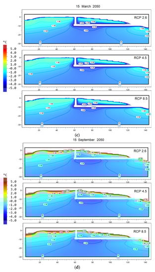 As mentioned above, the MAAT trends for the middle of 21st century (2041–2060) in comparison with the baseline period (1981–2000) were found as 0.0583, 0.0666 and 0.0833 °C∙a−1 for RCP 2.6, RCP 4.5 and RCP 8.5 scenarios, respectively. These trends were applied for our calculations of the permafrost thermal state from 2020 to 2050. We assumed that the snow depth and variations of wind activity for the forecasted period would not have any significant impact on the permafrost temperature in comparison to the MAAT characteristic. Based on these data, we ran the model by 2050 and received the ground temperature distributions shown in Figure 4.