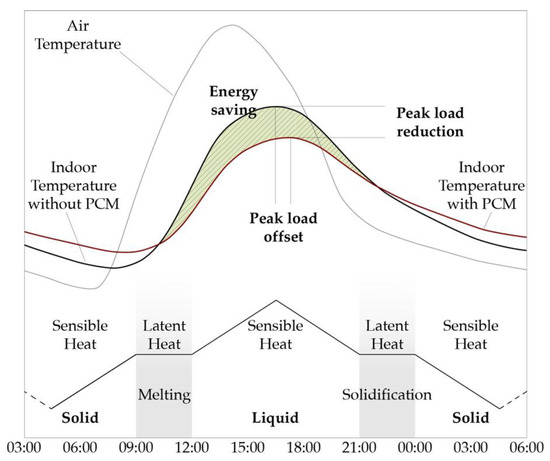 With PCM, the peak indoor temperature at daytime is lower and occurs at a delayed time if compared to the reference case without PCM thanks to the latent heat absorbed by the PCM during its melting phase change. During the night the PCM releases the latent heat during its solidification phase change and this brings about a slightly higher indoor temperature during the coolest hours of the day. In general, with the application of PCM, a more stable indoor temperature with minor fluctuations between daytime and nighttime can be achieved with a consequent reduction of the energy required for cooling which, in Figure 1, is represented by the colored area.