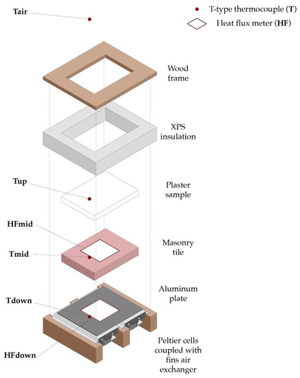 An experimental set up was realized to carry out the tests in a climatic chamber and is depicted in Figure 2. It is made of a 0.20 × 0.15 × 0.020 m3 plaster sample and a 0.20 × 0.15 × 0.028 m3 masonry tile positioned on a 0.003 m aluminum foil under which four Peltier cells are fixed. These are coupled with finned air exchangers and small fans in order to dissipate the heat on the warmer side. Moreover, a frame of XPS was added on the vertical surfaces to limit heat transfer on the edges and wooden elements are used to stiffen the set up. All the tests were taken in a climatic chamber [37] where temperature and heat flux sensors were used for the monitoring activity. T-type thermocouples (accuracy: 0.5 K), and heat flow plates (accuracy: 5% at 23 °C) were connected to a datalogger [38] through which data were acquired each 30 s. On both the surfaces of the masonry tile, shallow indentations were realized in order to allocate the heat flux sensors, so that their thickness would not affect the measures. Moreover, some thermal paste was applied in correspondence with each layer to limit the contact resistance as much as possible.