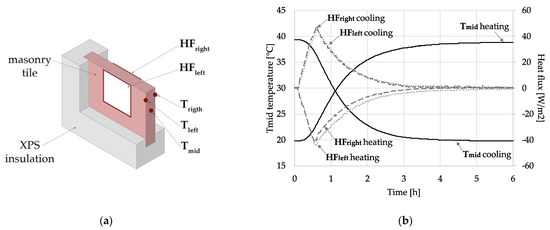 An additional experimental set up was realized to estimate the specific heat of the masonry tile, and therefore reduce the number of properties to be estimated through the numerical model to the properties of the plaster samples only. Part of the set up realized is depicted in Figure 3a and consisted of a 0.15 m × 0.30 m × 0.028 m masonry tile with an XPS frame to ensure a mono-dimensional heat flux. A heat flux meter and a T-type thermocouple were placed on each surface of the tile using thermal paste to improve the thermal contact and avoid any air gap, and a third T-type thermocouple was inserted into a hole in the middle of the tile. The test was conducted in the climatic chamber which was initially set at 20 °C, and once all the thermocouples on the tile read the same temperature, the chamber was brought to 40 °C until all the thermocouples read the same temperature again. It was then brought again to 20 °C and the test stopped as the thermocouples read the same value. In Figure 3b, the values acquired during the test are depicted. The specific heat [J/(kg·K)] was estimated to be about 800 J/(kg·K) through the following Equation (5):