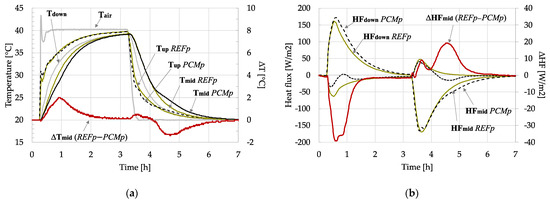 (a) Temperatures collected for both the reference and the PCM plaster samples. The curves of Tair and Tdown were the same for both tests, therefore only one was depicted in the graph. Moreover, the red line is the difference between the values of Tmid for the reference plaster and the PCM one, respectively. (b) Heat fluxes collected for both the reference and the PCM plaster samples. The red line is the difference between the values of HFmid for the reference plaster and the PCM one, respectively.
