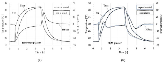 Calibration of the unsteady–state tests. (a) Test with the reference plaster, (b) test with the PCM plaster.