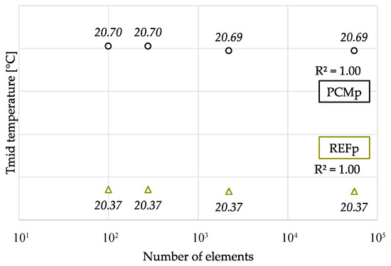 The calibration of the test with the reference plaster is depicted in Figure 6a while that of the PCM plaster is depicted in Figure 6b. The mesh was hexahedral and the mesh independence was verified as represented in Figure 7. Then the root mean square error (RMSE) was calculated as in Equation (7) and the values obtained are reported in Table 6: