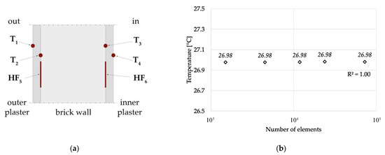 The properties of this plaster (here indicated as LITp) are depicted in Table 7 together with a recap of the thermal properties of the other simulated plasters. The focus of the simulations was the summer evaluation of the application of PCM on the external side of a wall. For this reason, the simulations that will be compared will have the same brick and interior plaster layers; this last one was the reference plaster (REFp), and the only difference will be the plaster applied as exterior layer. In Figure 9a the nomenclature and the position of the sensors used for the comparison are depicted. The simulations were carried out for some consecutive days, but the results were considered only from the second day on, to avoid the initial conditions applied from interfering with the results. The mesh applied was hexahedral, made of 1500 elements; however, the mesh independence was verified by carrying out the same simulation with higher numbers of elements, as depicted in Figure 9b.