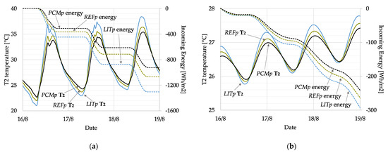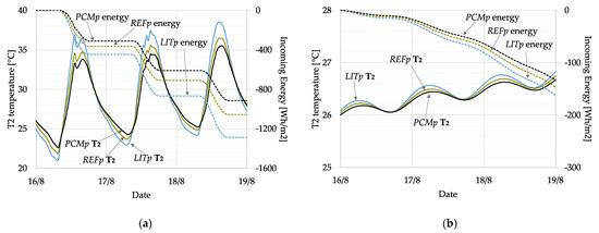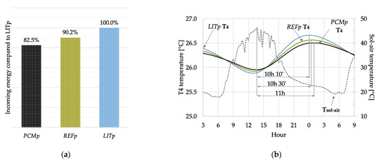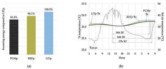In Figure 13a the percentage difference between the incoming energies in the three configurations with respect to LITp is summarized. As for the two-brick-thick wall, in the case of REFp the incoming energy, which affects the energy requirement for cooling, is almost 10% lower than LITp, while in the case of PCMp the reduction is of more than 18%. In Figure 13b the sol-air temperature (Tsol-air) is depicted together with the temperature reached on the inner side of the wall (T4) with focus on one day of simulation in order to highlight the delay in reaching the peak inner temperature. In the case of the LITp the delay is of 16 h and 20 min, in the case of the REFp it is of 16 h and 50 min, while in the case of the LITp it is of 16 h and 20 min. This means that the addition of PCM brings about an increase of the delay of 4% if compared to REFp and of 7% if compared to LITp.