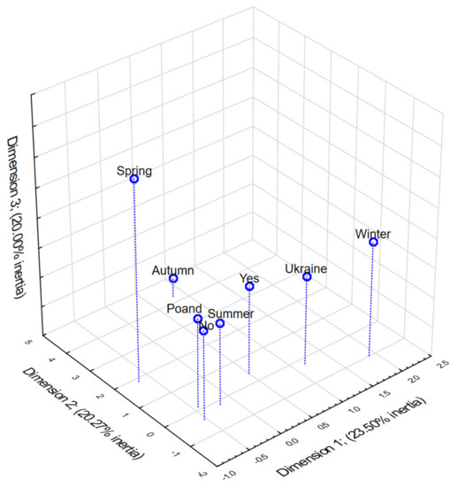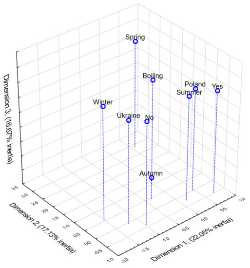 In the next step, a three-dimensional column coordinate diagram was generated showing the relationship between country, period of time when the largest amount of tap water was consumed and the use of tap water directly for drinking without boiling (Figure 1). According to the results, tap water consumers in Poland consumed tap water more frequently in summer and drank it directly from the tap without boiling. In Ukraine, tap water is used more often in winter and is not consumed directly for drinking (without prior boiling).