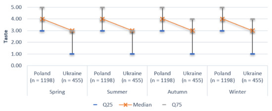 Taste of tap water was better rated by consumers in Poland than in Ukraine in spring (MPoland = 3.83; SDPoland = 1.01 and MUkraine = 2.56; SDUkraine = 1.22), summer (MPoland = 3.8; SDPoland = 1.03 i MUkraine = 2.56; SDUkraine = 1.27), autumn (MPoland = 3.78; SDPoland = 1.04 and MUkraine = 2.62; SDUkraine = 1.21) and in winter (MPoland = 3.78; SDPoland = 1.11 and MUkraine = 2.64; SDUkraine = 1.28). On the basis of Mann–Whitney U-test results, it was found that the above differences were statistically significant, which means that tap water supplied in Poland had significantly better taste than that supplied in Ukraine in spring: Z = 17.57; p < 0.001; rg = 0.56; summer: Z = 16.72; p < 0.001; rg = 0.53; autumn: Z = 16.31; p < 0.001; rg = 0.52; and in winter: Z = 15.25; p < 0.001; rg = 0.48 (Table 8, Figure 3).