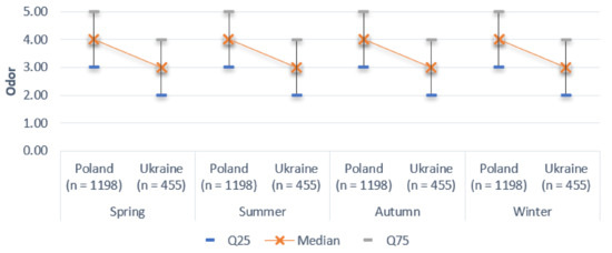 Recipients of tap water from Poland and Ukraine also differed in their evaluation of its odor. Similarly to taste, tap water odor was rated better in Poland than in Ukraine. This was true for spring (MPoland = 3.89; SDPoland = 1.02 and MUkraine = 2.98; SDUkraine = 1.17), summer (MPoland = 3.85; SDPoland = 1.04 and MUkraine = 2.95; SDUkraine = 1.16), autumn (MPoland = 3.85; SDPoland = 1.05 and MUkraine = 3.02; SDUkraine = 1.11) and winter (MPoland = 3.844; SDPoland = 1.12 and MUkraine = 3.08; SDUkraine = 1.17). These differences reached statistical significance, as shown by analysis with the Mann–Whitney U test, for each season, i.e., spring: Z = 13.82; p < 0.001; rg = 0.44; summer: Z = 13.78; p < 0.001; rg = 0.44; autumn: Z = 13.21; p < 0.001; rg = 0.42; and winter: Z = 11.79; p < 0.001; rg = 0.38 (Table 9, Figure 4).