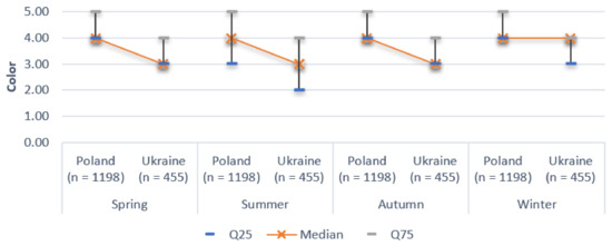 The next parameter of tap water, i.e., color, also significantly differed in Poland compared to Ukraine. Recipients of tap water supplied in Poland rated its color better than recipients in Ukraine with respect to each season, i.e., spring (MPoland = 4.05; SDPoland = 1.04 and MUkraine = 3.31; SDUkraine = 1.2), summer (MPoland = 4.01; SDPoland = 1.07 and MUkraine = 3.2; SDUkraine = 1.25), autumn (MPoland = 4.01; SDPoland = 1.07 and MUkraine = 3.27; SDUkraine = 1.19) and winter (MPoland = 4.03; SDPoland = 1.08 and MUkraine = 3.4; SDUkraine = 1.19). The analysis by Mann–Whitney U test showed that there were statistically significant differences between the two groups in the assessment of tap water color, both in the context of water supplied in spring: Z = 11.48; p < 0.001; rg = 0.36; summer: Z = 11.89; p < 0.001; rg = 0.38; autumn: Z = 11.56; p < 0.001; rg = 0.37; and winter: Z = 10.08; p < 0.001; rg = 0.32 (Table 10, Figure 5).