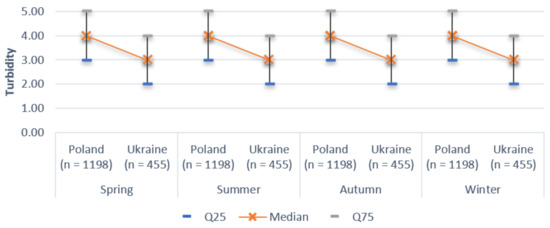 Turbidity of tap water was also rated significantly differently in Poland and Ukraine. Ratings of the above tap water parameter were higher among respondents from Poland compared to those from Ukraine. This was the case both spring (MPoland = 3.96; SDPoland = 1.06 and MUkraine = 3.13; SDUkraine = 1.15), summer (MPoland = 3.94; SDPoland = 1.08 and MUkraine = 3.11; SDUkraine = 1.17), autumn (MPoland = 3.94; SDPoland = 1.07 and MUkraine = 3.14; SDUkraine = 1.13) and winter (MPoland = 3.95; SDPoland = 1.09 and MUkraine = 3.19; SDUkraine = 1.18). These differences turned out to be statistically significant, which was shown by Mann–Whitney U test analysis. This means that tap water supplied in Poland is rated significantly better than that in Ukraine in terms of turbidity at any time of the year, i.e., spring: Z = 12.91; p < 0.001; rg = 0.41; summer: Z = 12.71; p < 0.001; rg = 0.4; autumn: Z = 12.64; p < 0.001; rg = 0.4; and winter: Z = 11.75; p < 0.001; rg = 0.37 (Table 11, Figure 6).