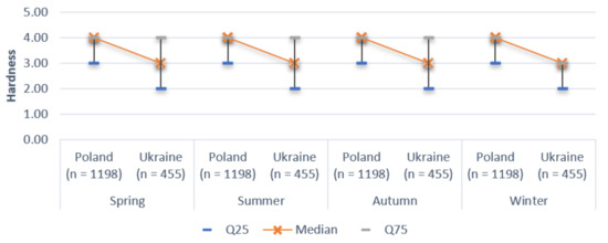Tap water supplied in Poland was also rated significantly better than that supplied in Ukraine with respect to hardness. These differences were noted for each season, i.e., spring (MPoland = 3.54; SDPoland = 1.14 and MUkraine = 2.77; SDUkraine = 1.13), summer (MPoland = 3.52; SDPoland = 1.15 and MUkraine = 2.78; SDUkraine = 1.13), autumn (MPoland = 3.52; SDPoland = 1.15 and MUkraine = 2.79; SDUkraine = 1.11) and winter (MPoland = 3.51; SDPoland = 1.17 and MUkraine = 2.75; SDUkraine = 1.13). Based on the results of the Mann–Whitney U test, it was found that there were statistically significant differences between the two groups in assessments of tap water hardness in spring: Z = 11.62; p < 0.001; rg = 0.37; summer: Z = 11.24; p < 0.001; rg = 0.36; autumn: Z = 11.05; p < 0.001; rg = 0.35; and winter: Z = 11.46; p < 0.001; rg = 0.36 (Table 12, Figure 7).