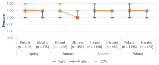 Recipients of tap water from Poland and Ukraine also differed significantly in their assessment of tap water pressure. In spring, tap water pressure was rated better in Poland (M = 3.97; SD = 1.1) than in Ukraine (M = 3.6; SD = 1.03). The same was true for tap water pressure delivered in summer (MPoland = 3.68; SDPoland = 1.19 and MUkraine = 3.39; SDUkraine = 1.11), autumn (MPoland = 3.96; SDPoland = 1.11 and MUkraine = 3.58; SDUkraine = 1.04) and winter (MPoland = 3.99; SDPoland = 1.11 and MUkraine = 3.6; SDUkraine = 1.08). The above differences reached statistical significance, as shown by the Mann–Whitney U test analysis, for the spring: Z = 7.2; p < 0.001; rg = 0.23; summer: Z = 4.95; p < 0.001; rg = 0.16; autumn: Z = 7.27; p < 0.001; rg = 0.23; and winter: Z = 7.26; p < 0.001; rg = 0.23 (Table 13, Figure 8).