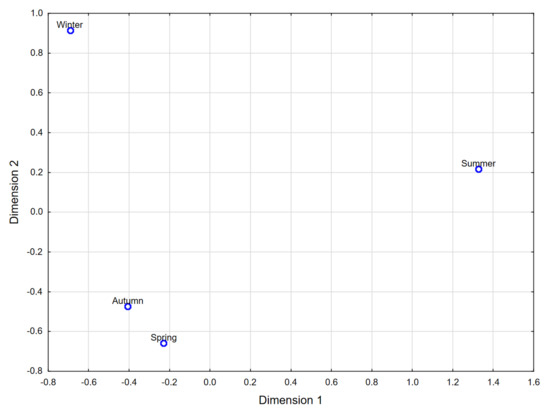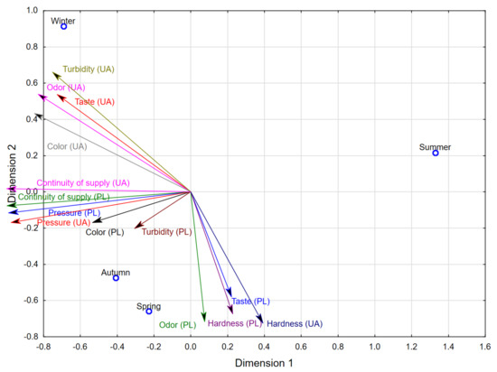 The following graph (Figure 11) shows the resulting multidimensional scaling map. It shows that winter and summer differed from the other seasons in terms of ratings for all analyzed parameters of tap water supplied in Poland and Ukraine. Similarities were noted between spring and autumn, the location of which on the multidimensional scaling map indicates that both seasons were similar in terms the evaluations of the above parameters and, at the same time, differed clearly from both winter and summer.